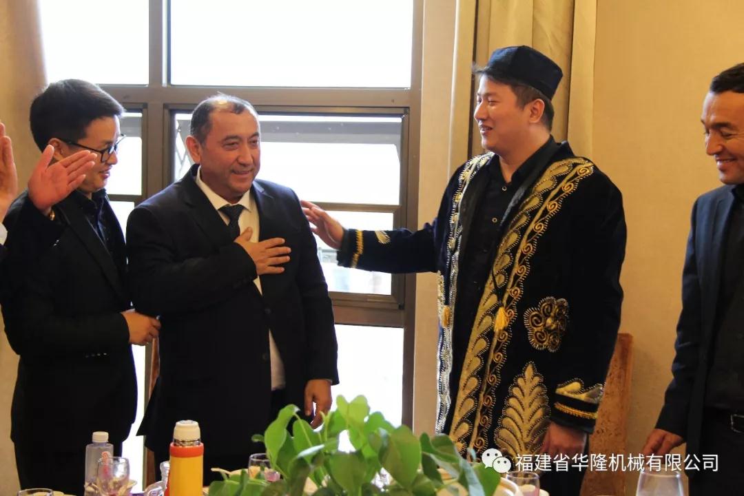 在兩方參觀完生產車間后,華隆機械行地主之誼,熱誠得邀請烏方納沃伊州代表團到冠豪大酒店用餐。烏方納沃伊州市長也表示出了滿滿的誠意,拿出烏茲別克斯坦傳統圓餅形面包與我們分享。并為華隆機械銷售部經理披上象征烏茲別克斯坦最高榮譽的傳統服飾。